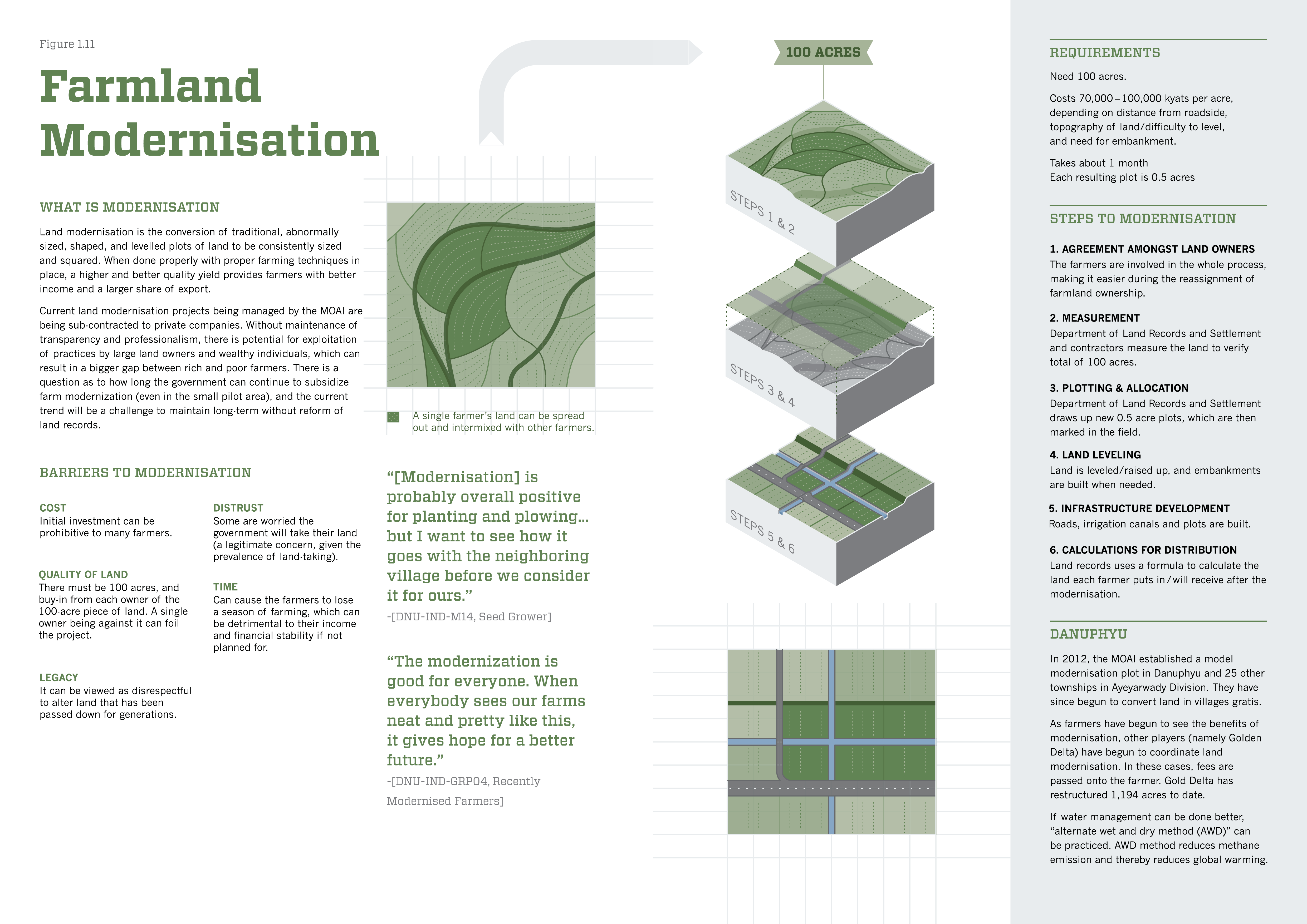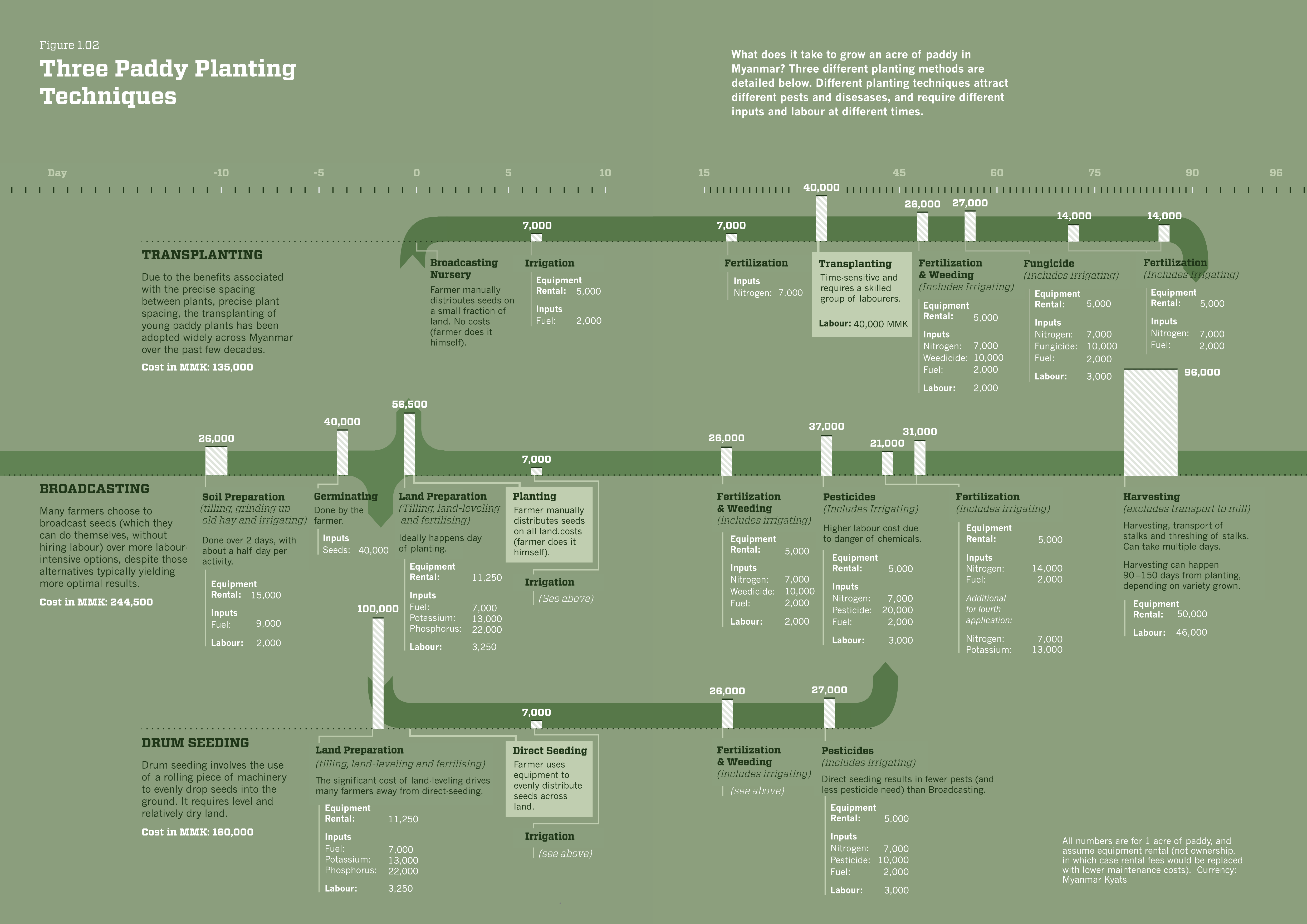I created 17 visualizations in 7 days for Proximity Designs' in‐depth report on Myanmar's paddy and rice ecosystem. Our intent was to use visual design to make critical information more understandable and expose otherwise hidden connections. I collaborated with the researchers, designer, and subject matter experts behind the report to ensure the visualizations appropriately voiced the insights from the field. While it is always ideal to be part of the foundational research, this project is an excellent reminder of how open and deliberate collaboration can promote shared understanding and lead to high-quality work.